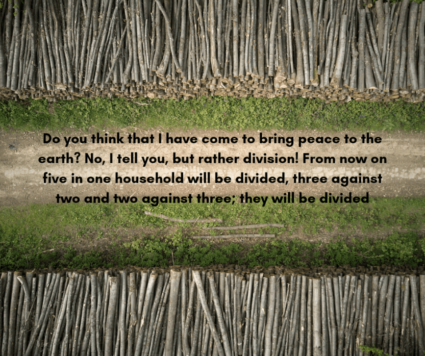 Jesus is the cause of division. That is not what we typically associate with Christ. When Christ says to the gathered people today, “Do you think that I have come to bring peace to the earth? No, I tell you, but rather division!,” this is not the picture of Christ that we typically hold and hear and teach others about. And yet, here it is, coming from Christ, a declaration that all will be divided, that we will be against one another, that families will be divided against one another. How do we reconcile this message today with the picture that we have typically received? Those messages of love. The way of love that has been put before us. The message and way of love that is about building up the community, of finding unity through our faith and practice of our beliefs. How are we to receive this declaration of division when the building of the kingdom we constantly are working towards is about stripping away division?